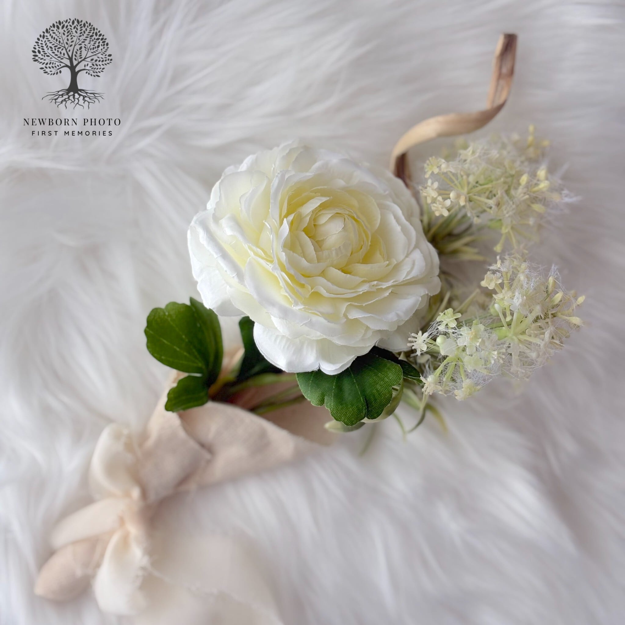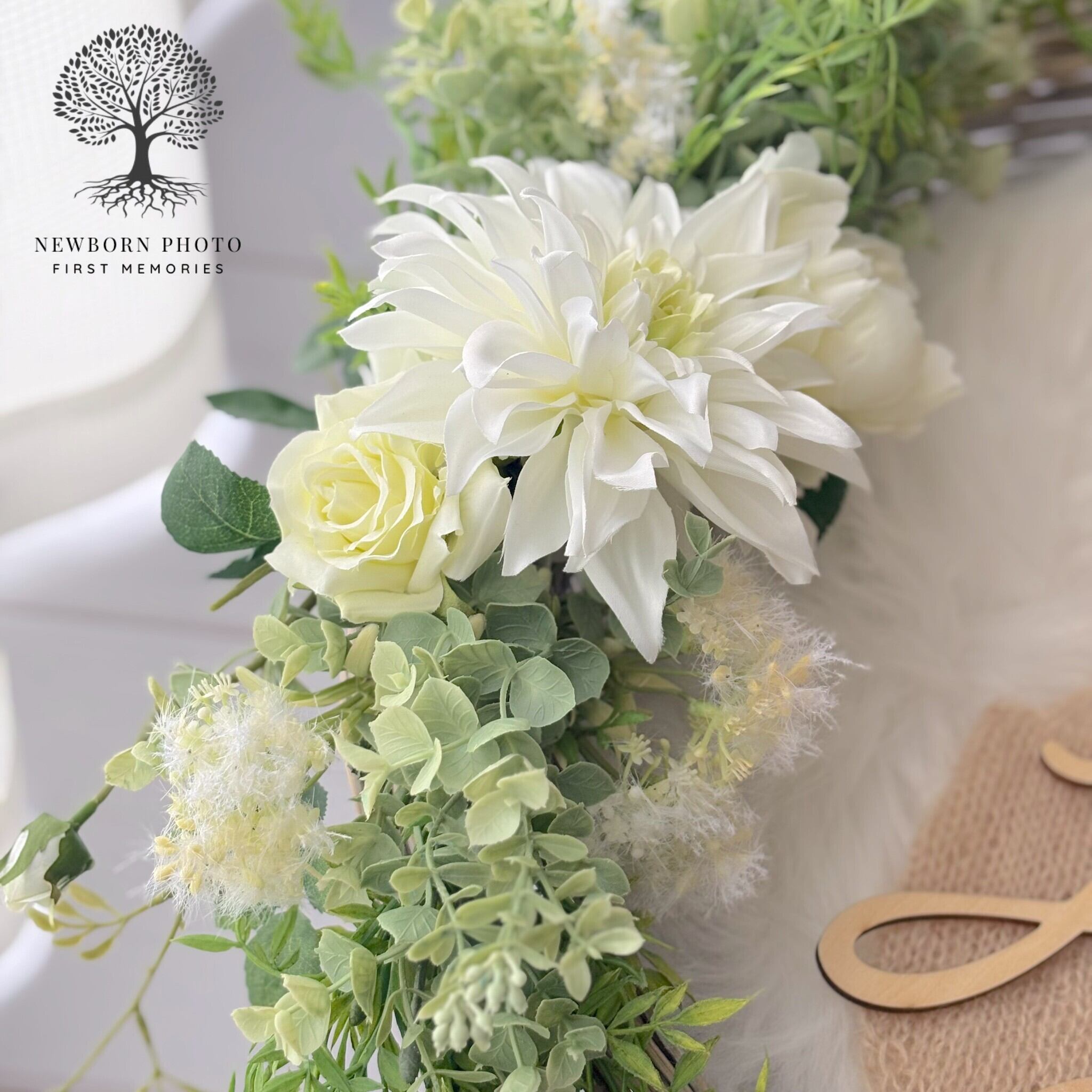 ◎ダリアやラナンキュラスを中心に、自然なグリーンを添えた柔らかなブーケを制作しました。落ち着いたアイボリーの色味が、赤ちゃんの可愛らしさを引き立てます^^白・ベージュ・アイボリーを基調としたナチュラルなニュートラルカラーで統一しており、ナチュラルな雰囲気のセットとなっています^^