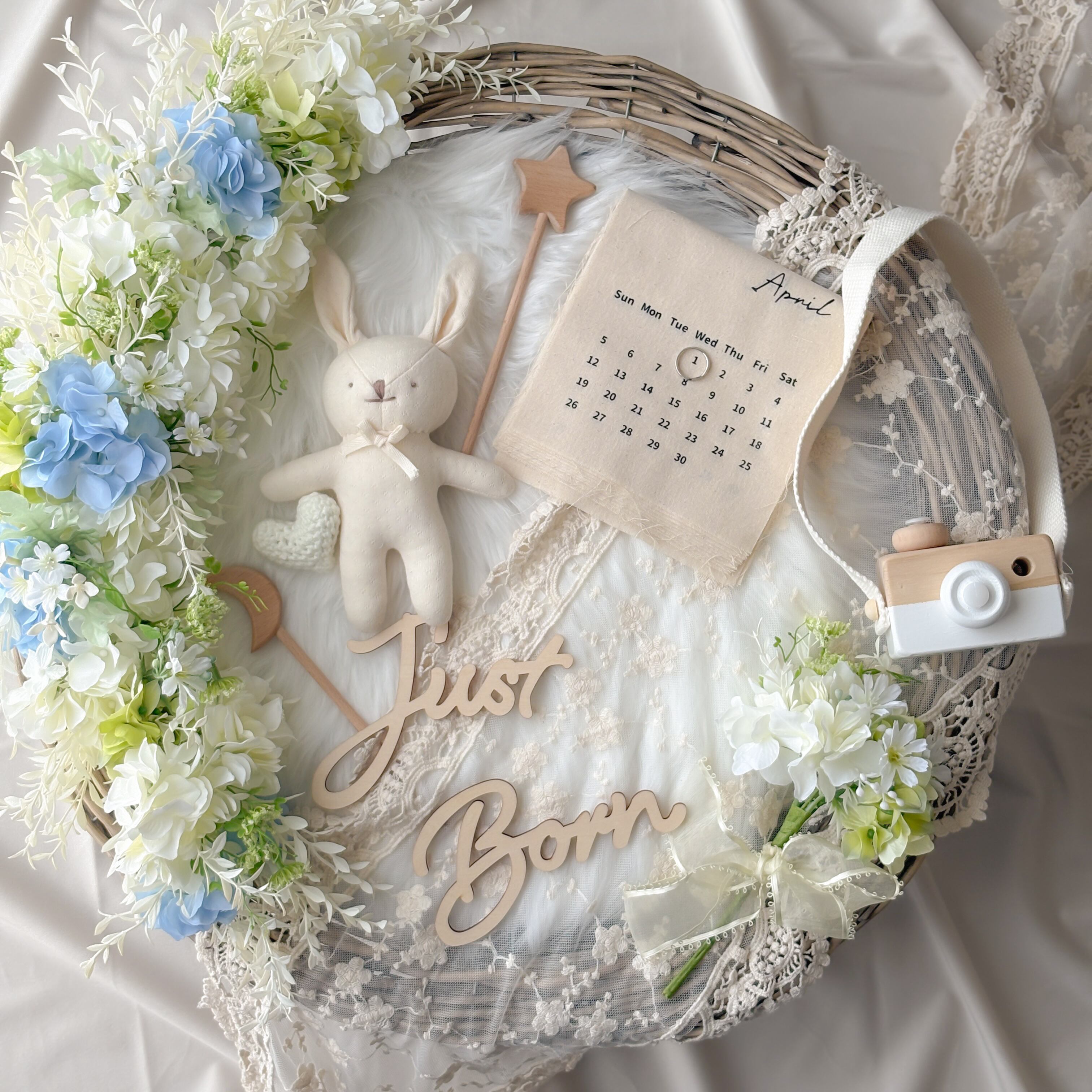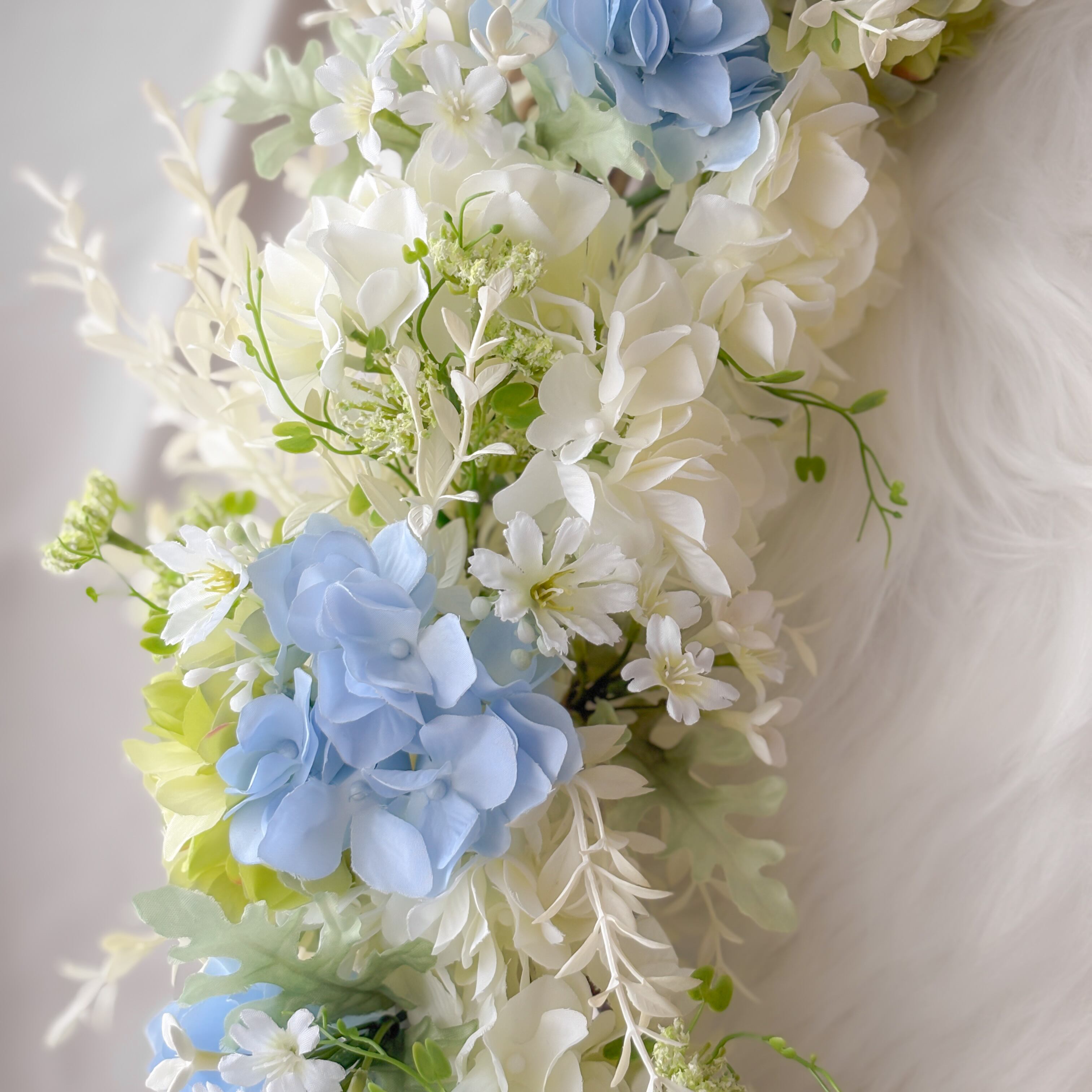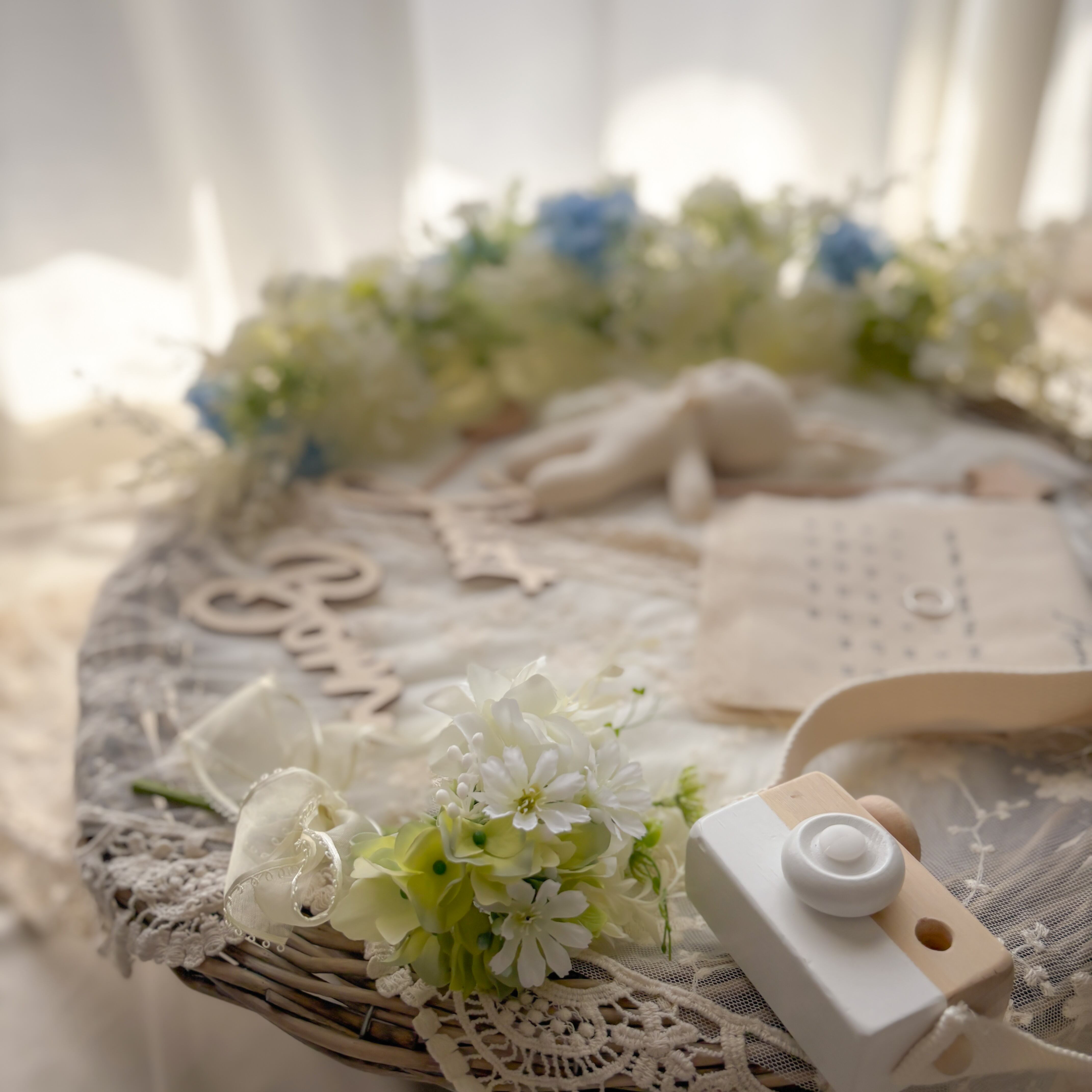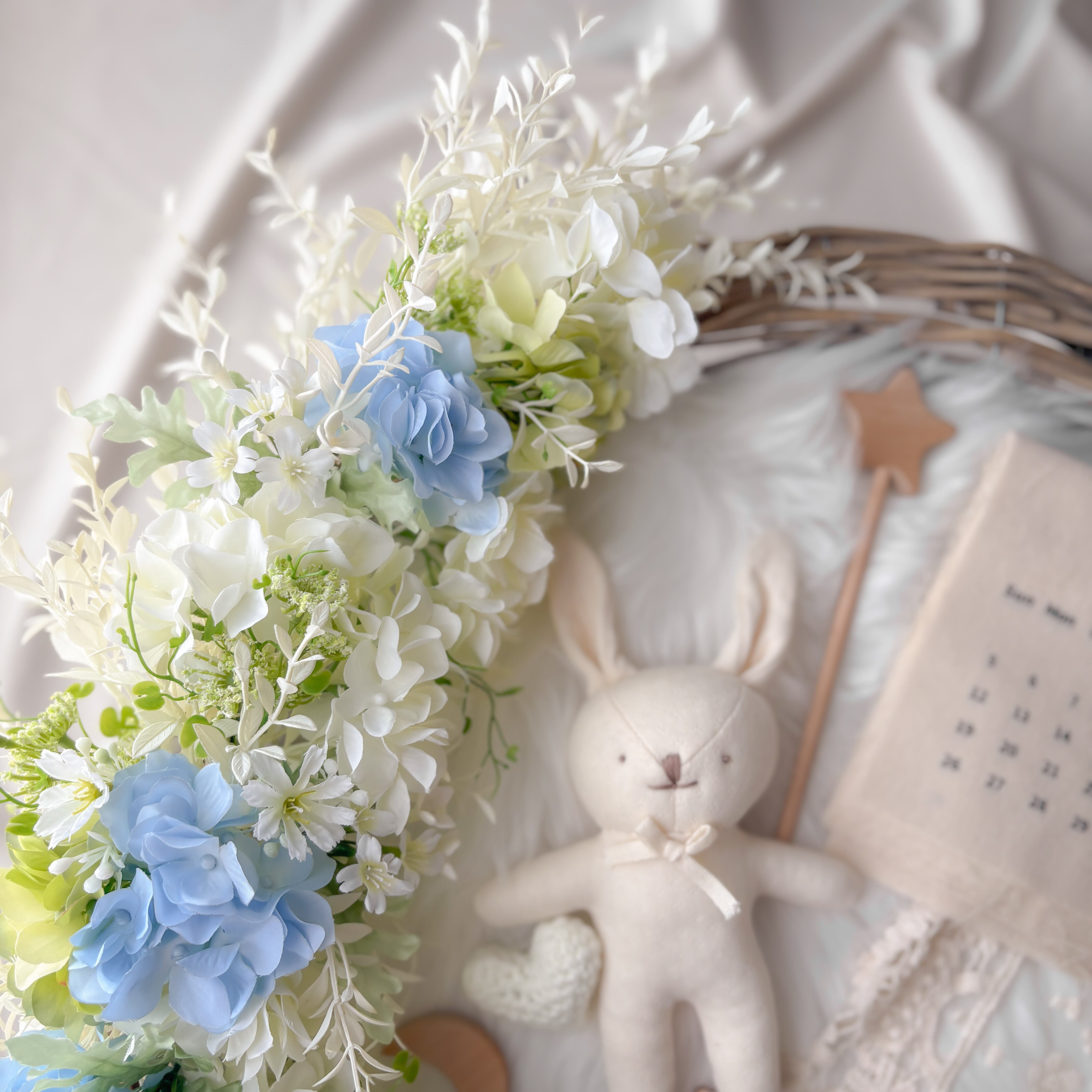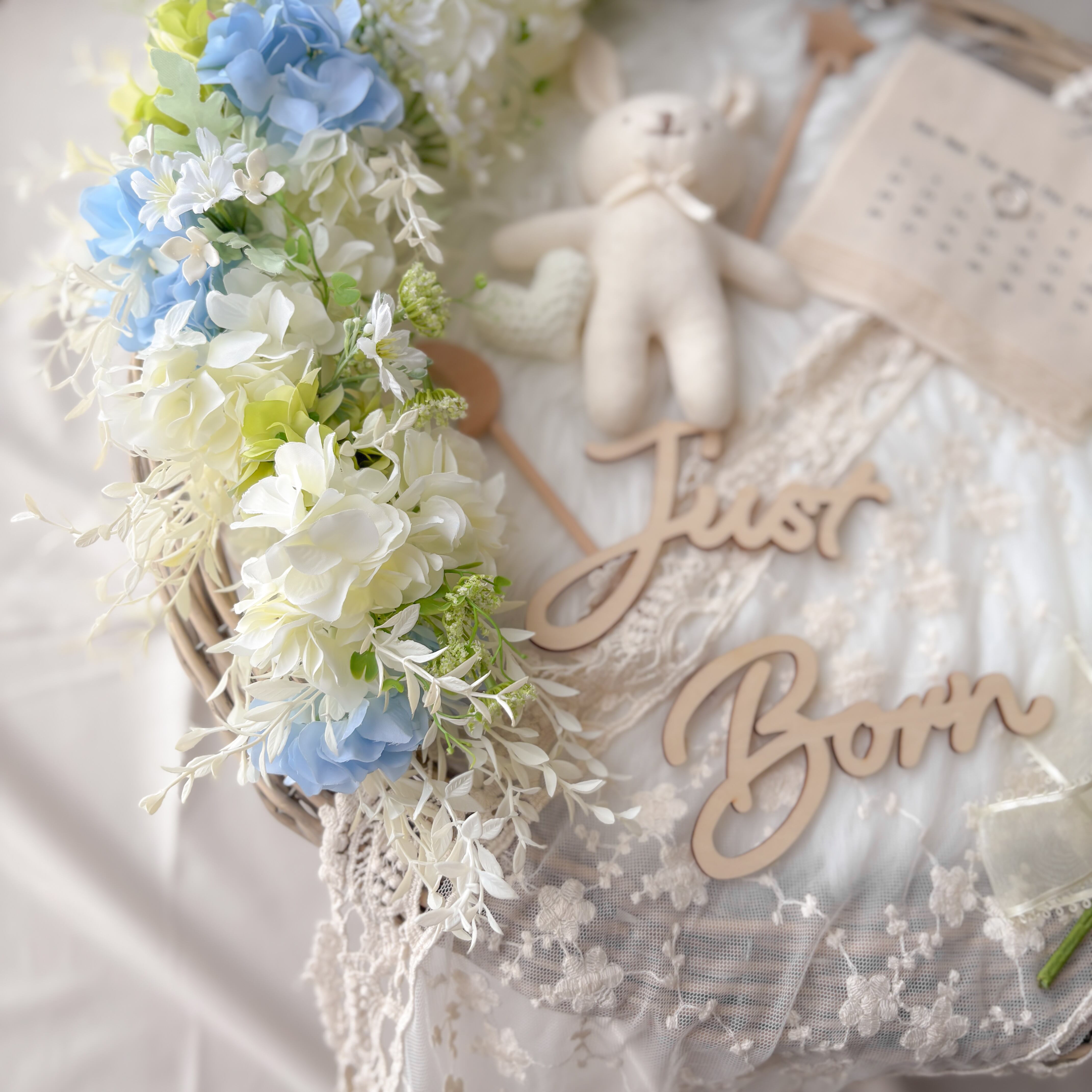 ◎淡いブルー、グリーン、ホワイトを重ねたアジサイは、赤ちゃんの肌色を優しく引き立て、写真に透明感と清潔感をプラス。小さな花びらが重なり合うアジサイ特有の質感が、生まれたての繊細さとぴったり重なります。