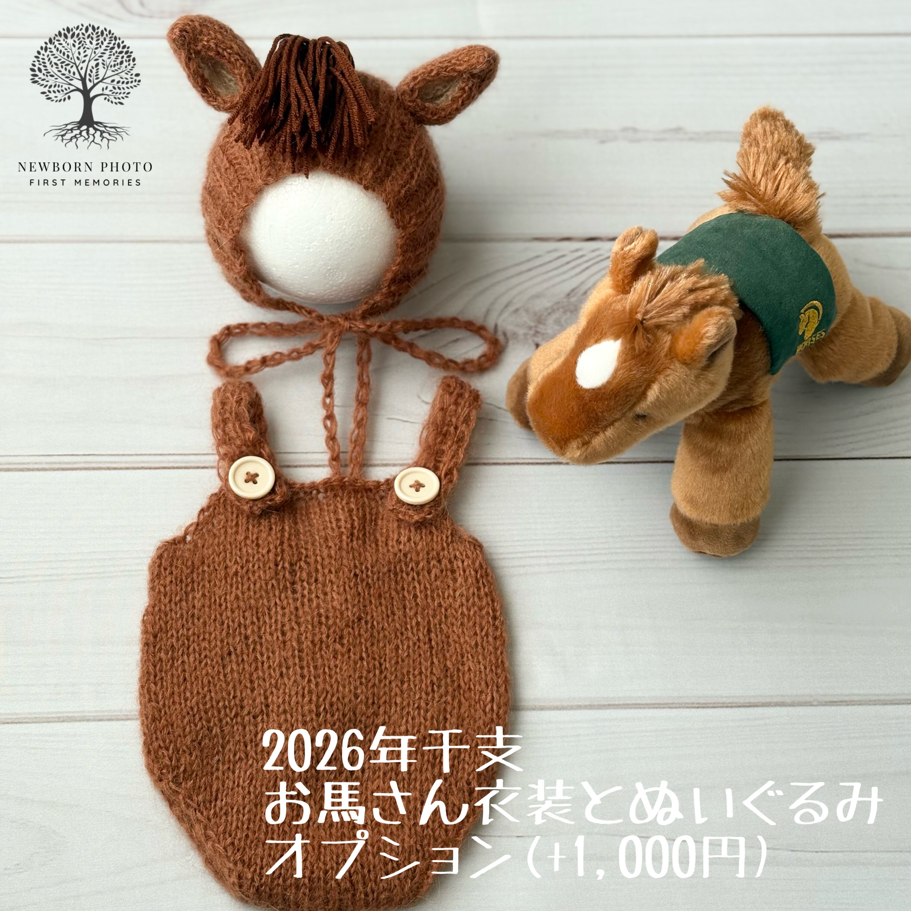 ◎ 2026年午年ということで、お馬さんの衣装とぬいぐるみセットをオプションに追加させて頂きました^^+1,000円でお付けできますので、ご希望の方はオプションからお選びください。